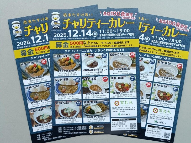 当イベントは500円以上の募金で「よこすか海軍カレー」または「横須賀海自カレー」を1杯提供するもので、収益金は全額、神奈川新聞歳末たすけあい募金に寄付するものです。