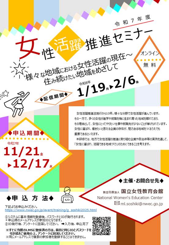 独立行政法人国立女性教育会館(NWEC)では、地方で女性活躍の推進に取り組む企業や自治体等の実例を通して「女性に選ばれ活躍できる地域づくり」を考えるためのセミナーを開催します![]()