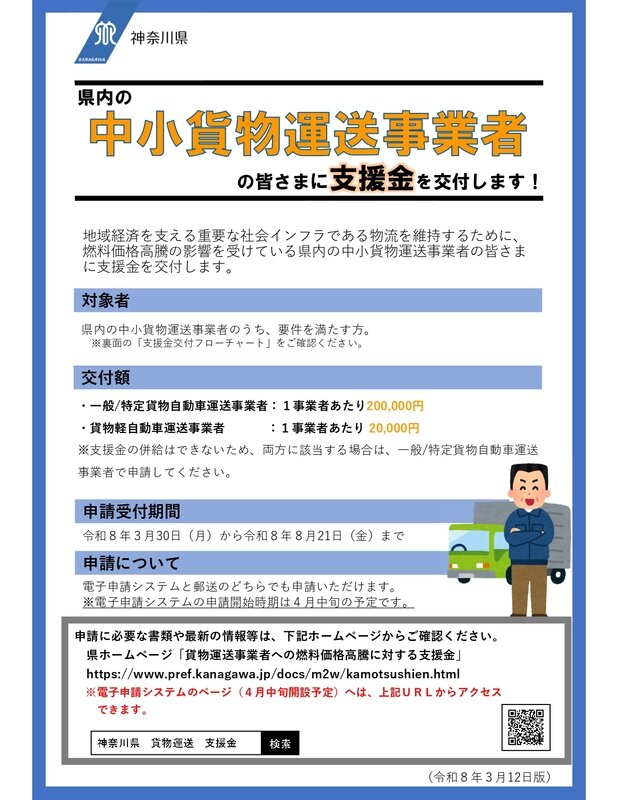 神奈川県が、貨物運送事業者に対して燃料価格高騰に対する支援金を交付します![]()